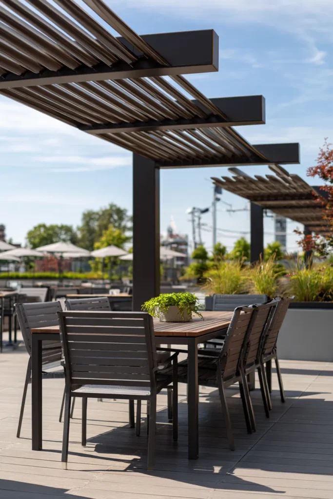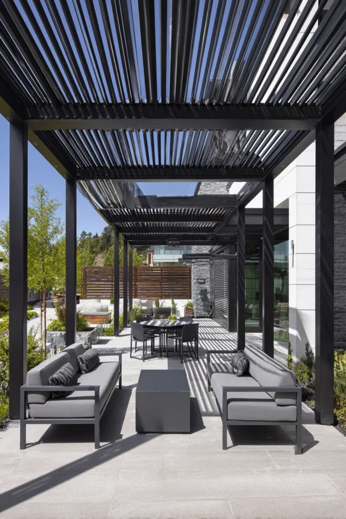 This design features a clean, dark metal pergola with a roof made of very wide, closely-spaced louvered slats, providing great filtered shade over an outdoor dining table. The structure is substantial and perfectly frames the comfortable, modern dining set, giving the whole area a sense of enclosure and intimacy in an otherwise open space. It’s a sophisticated and practical idea for alfresco meals.