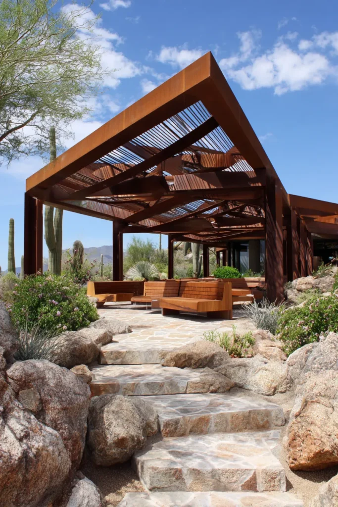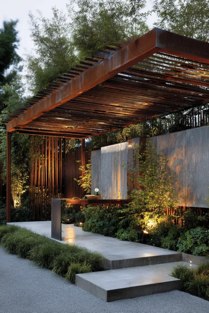 I absolutely love that aged, rustic look of the Corten steel—it feels so high-end and intentional, not at all like just a rusty old piece of metal! It provides such a gorgeous, warm canopy, making the whole pathway feel intimate and protected. This is the perfect sophisticated backdrop for my backyard and would look truly amazing lit up at night with soft, upward-facing lights.