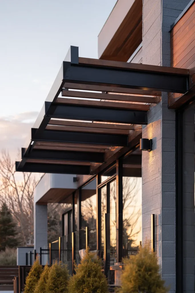 This unique metal pergola is seamlessly integrated with the architecture of the house, featuring bold, thick beams that project outwards from the wall in a cool, cantilevered style. The design is all sleek, dark metal and wood paneling, giving it an edgy, modern industrial look without any visible support columns. It acts as a stylish, linear awning, giving coverage over the side of the home.
