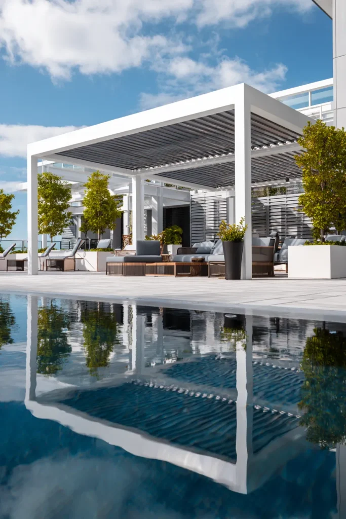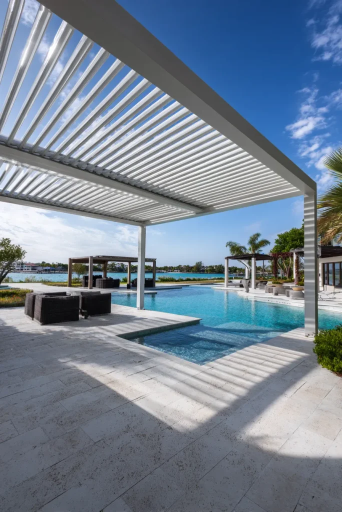 What we have here is a spectacular, expansive pergola in a light-colored or white metal finish, perfectly shading a luxurious pool deck area. This structure provides a seriously chic cabana spot for lounging in comfortable outdoor seating, right by the water’s edge. The overall setting screams bright, coastal luxury and looks exactly like the kind of resort where you’d want to spend an entire summer.