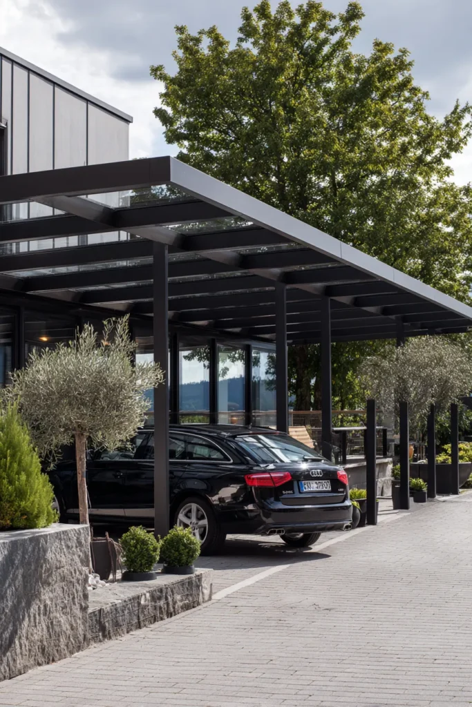 I think using a pergola design as a carport is absolutely genius—it just looks so much sleeker and more integrated than a regular old garage door! The clean lines of the dark metal structure instantly give this area a modern, custom look that elevates the whole front of the house. It’s such a practical way to keep your car safe from the weather while still showing off your great design taste and keeping your property looking high-style.