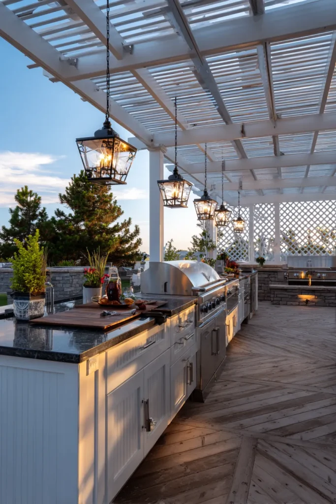 This is exactly the kind of amazing space I would want for hosting all my summer parties, I just love how fresh and open the white metal feels! It’s so smart to use a pergola to define the kitchen area as a real outdoor room, keeping the chef happy with some shade. Everything about this setting, from the stylish pendant lights to the perfect placement for the grill, just screams fun and effortless summer entertaining.