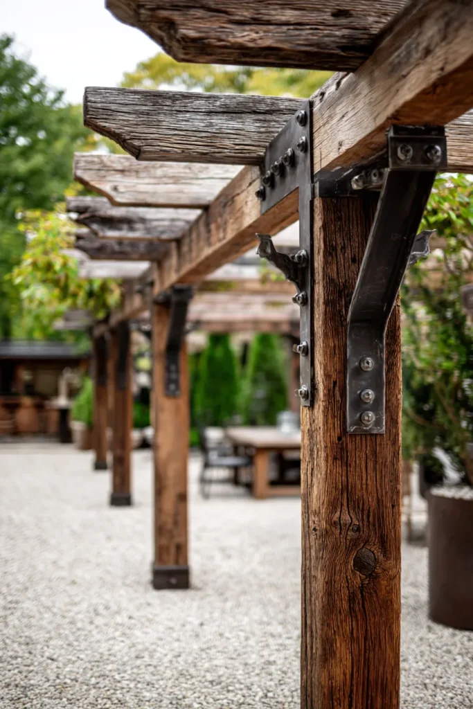 This pergola blends heavy, rustic wood beams with modern, dark metal brackets and connectors, giving it a warm but robust industrial feel. The structure creates a long, shaded walkway or defined area, using thick, aged timber posts for a grounded, natural look. It’s a wonderful example of combining materials for a textured, welcoming, and very sturdy design.
