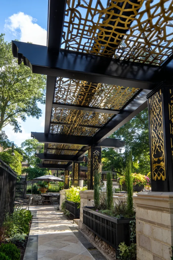 This unique metal pergola features intricate laser-cut panels, giving it an ornate and almost geometric, lacy look that’s just swoon-worthy. It acts as a stunning transition or entryway, leading you down a lush garden path lined with stone planters and vibrant foliage. This design is clearly meant to be a true artistic statement piece that offers a peek of shade and incredible visual texture.