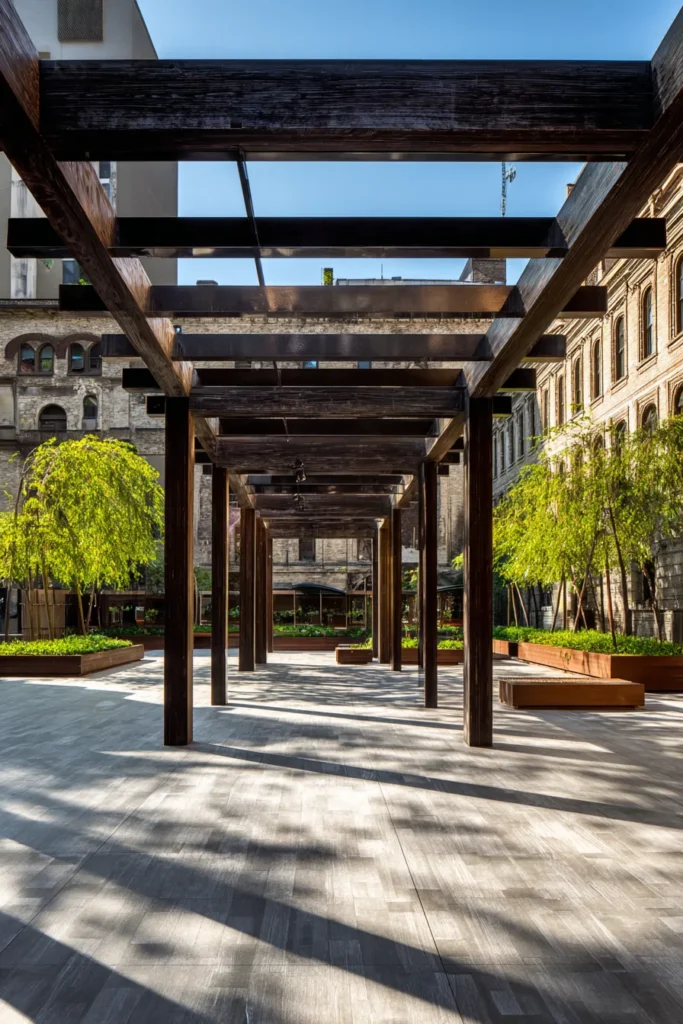 This impressive pergola is a long, extended structure creating a striking corridor or walkway across a large plaza or courtyard. It uses thick, dark metal beams combined with rustic wood planking for a robust yet refined look. The structure is open and airy, designed to guide the eye and provide dappled shade over the wide, paved area, feeling both modern and grounded in nature.