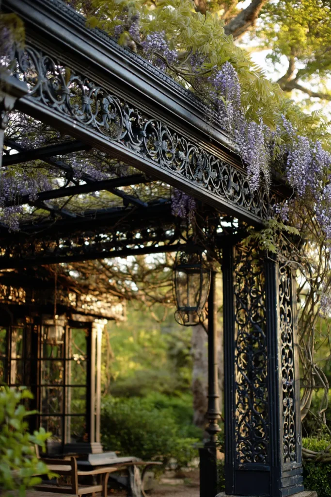 Oh my goodness, this is pure romance and truly takes my breath away—it looks like something straight out of a beautiful old novel! The delicate, lacy metal work is so gorgeous and the way the purple wisteria drapes over the top is just magical. I think this idea is stunning because it’s a structure that only gets more beautiful as the vines mature, creating the most enchanting and cozy spot for a little table and chairs.