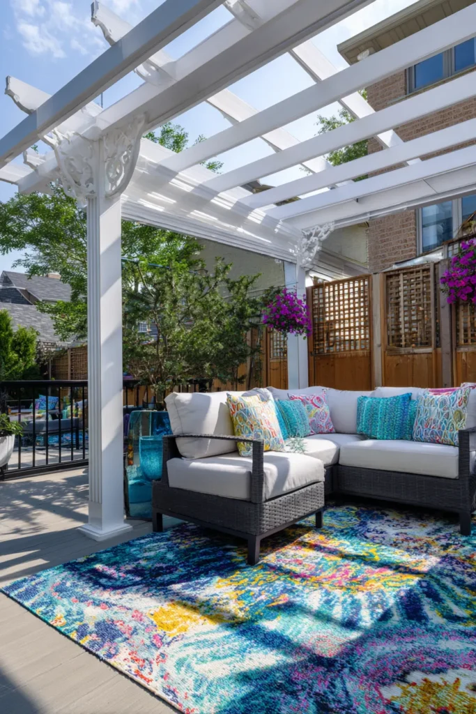 This pergola is a super light and airy white metal structure with an open-lattice roof, creating a chic little cabana space right by a pool. It perfectly frames a cozy outdoor seating area, which is instantly warmed up with a fun, vibrant printed rug and colorful throw pillows. It embodies that relaxed, happy, and breezy coastal style that feels like a permanent vacation.