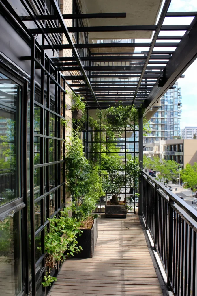 This design is truly the perfect solution for apartment dwellers, featuring a tall, dark metal structure that expertly encloses a narrow city balcony or terrace. It uses the framework to support climbing plants and vertical planters, creating a gorgeous green oasis even high up in a high-rise. The metal design keeps the space feeling open and airy while adding privacy and an amazing urban edge.