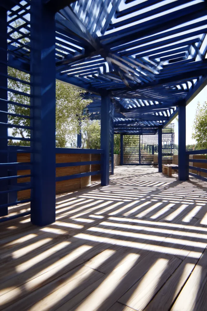 Talk about a pop of color! This contemporary metal pergola is painted a striking, deep shade of blue that really makes it stand out against the landscape and sky. It features very deep, dimensional slats that create those incredibly dramatic shadow patterns on the deck below. The structure helps define a large open patio area, perfect for entertaining and giving the space a distinctly modern, playful edge.