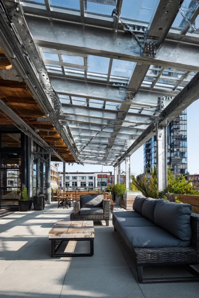 Here we have a fantastic example of blending industrial chic with functional outdoor coverage, using a sleek metal pergola topped with clear or frosted panels, maybe glass or polycarbonate. This style extends the living space outdoors, offering protection from the rain while still keeping the area bright and airy. It creates a stunning, modern outdoor lounge perfect for city living or as an extension off a contemporary home.