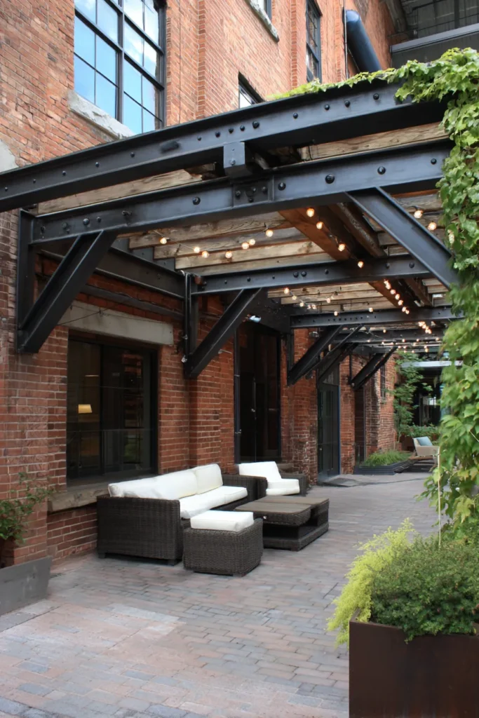 This is exactly the kind of cozy, cool setup I would want right outside my front door! I love how the dark metal and the string lights look against that gorgeous brick—it has so much character and feels instantly like a welcoming place to hang out. It’s a great example of a simple metal design that doesn’t compete with the building’s architecture but just adds that perfect touch of structure and charm.