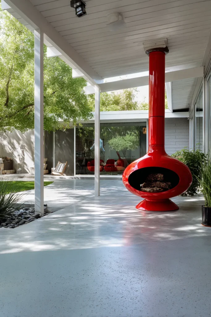 Talk about making an entrance! This patio is dominated by one of the most recognizable icons of Mid-Century design: a dramatically suspended red fireplace. The sleek, elliptical shape and bold primary color contrast perfectly with the simple white posts, polished concrete floor, and expansive glass walls of the house. It’s a sculptural, functional piece of art that anchors the entire covered patio space.