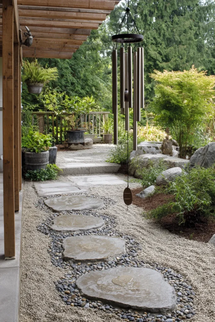This detail shot proves that the Mid-Century aesthetic extends right down to the ground you walk on, blending clean design with a serene, organic feel. The path features large, irregular natural stone stepping slabs set into a bed of contrasting light pea gravel and darker river stones. The linear wood pergola overhead and the tall, metallic wind chime add a wonderful vertical element, suggesting a quiet, meditative space.