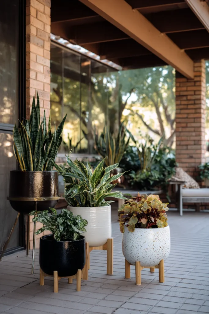 What makes this look so successful is the clever use of vertical space—getting your plants off the ground with those stands makes them feel like essential pieces of furniture! The variety of textures, from the glossy pots to the speckled planter, keeps the whole arrangement feeling vibrant and collected. It’s the easiest way to bring life and that signature MCM style to your outdoor space!