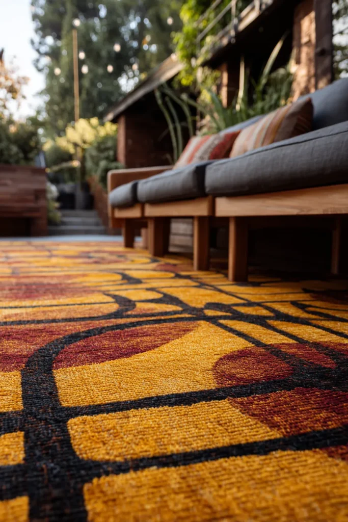 Talk about laying down some retro style! This photo highlights a gorgeous outdoor area rug in a striking pattern of red, orange, and golden yellow that anchors the entire seating area. The strong, geometric black lines and contrasting warm colors immediately bring a cozy, vintage vibe to the patio floor, proving that your décor shouldn’t stop at the furniture. The rug makes the simple wood-framed sofa look instantly warmer and more inviting.