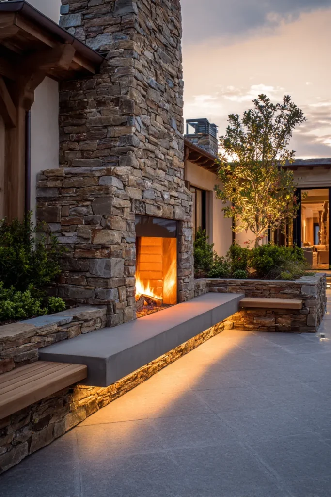 This is a masterclass in blending rustic warmth with sleek modern lines. The dominating feature is a tall, impressive stacked stone fireplace that provides incredible texture and a beautiful focal point. In true mid-century form, functionality is key: a sleek floating concrete bench extends from the hearth, backlit with warm, inviting lighting, offering both seating and a dramatic architectural line.