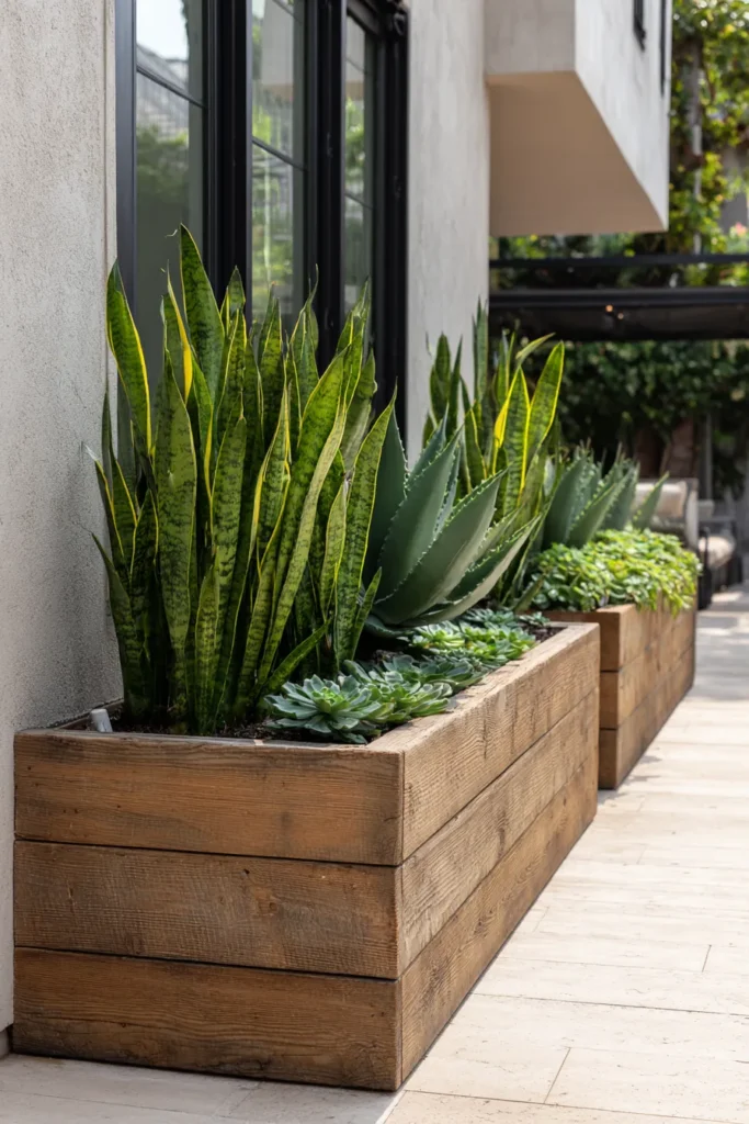 Nothing says effortless Mid-Century style quite like the right mix of natural materials and easy-care succulents, which this gorgeous patio achieves perfectly with its simple wooden planters. The long, rectangular shape and unstained wood planks are very typical of the MCM period, providing a beautiful, rustic contrast to the smooth stucco walls and crisp paving stones. Using Snake Plants and Agave in the planters is a genius move, as their strong vertical lines and bold shapes enhance the architecture’s linear quality and offer that essential touch of low-maintenance greenery.
