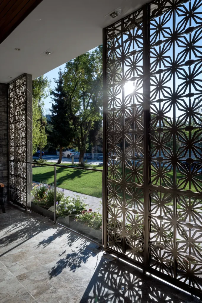 I am completely obsessed with the way the sun catches these screens, casting those incredible starburst shadows all over the patio floor, it’s like a piece of ever-changing natural art! It gives the space such a sophisticated and exclusive feel, like you’ve stepped into a swanky Palm Springs retreat. Seriously, who needs a boring wall when you can have this much visual drama and texture? It feels so chic and absolutely timeless.