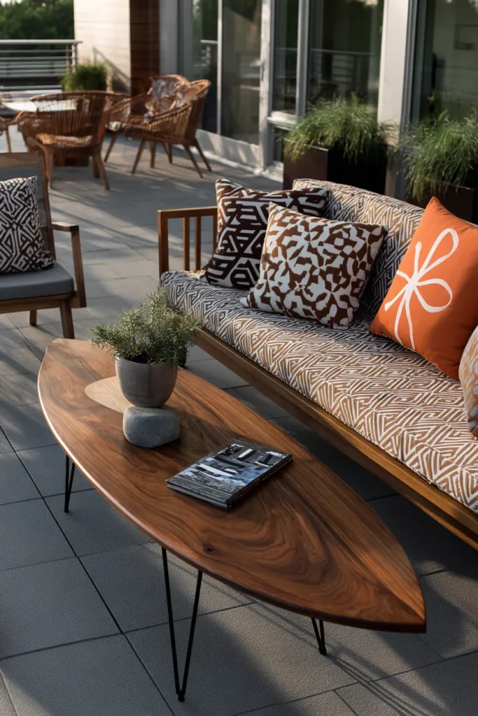 Talk about capturing that carefree California retro charm—this patio is serving up serious style with its playful textures and bold patterns! The standout piece is definitely that surfboard-shaped coffee table set on those classic hairpin legs, a truly fun and unique nod to the era’s relaxed, beachy vibe. The low-slung teak sofa is piled high with decorative pillows featuring graphic, geometric prints and pops of optimistic tangerine orange, which is an iconic Mid-Century color. It all sits on a clean, modern tiled terrace, perfectly blending retro flair with contemporary comfort.