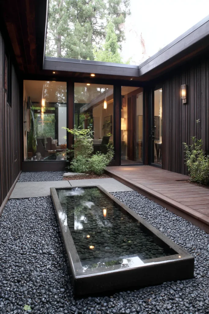 Serene Courtyard with a Reflecting Pool and Dark Wood