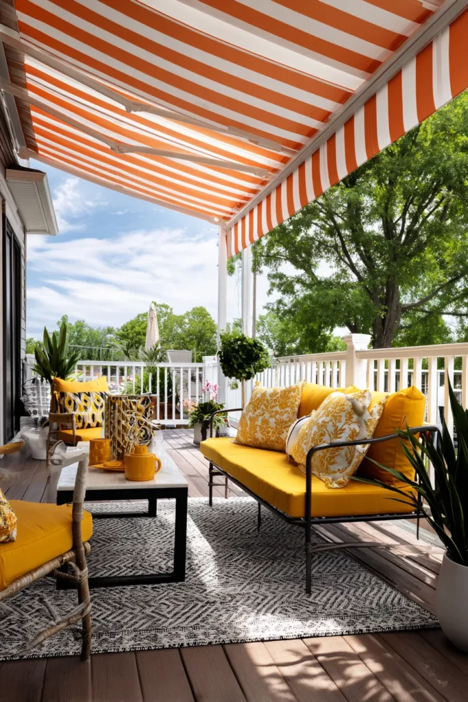 Playful Patio with Sunny Yellow Accents and Striped Awning