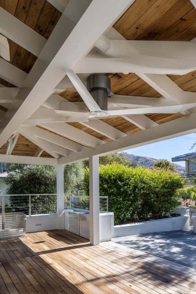 I’m completely obsessed with how cozy this space feels, thanks to the stunning marriage of white and wood. That gorgeous wood ceiling detail adds so much architectural interest and a lovely sense of enclosure without feeling dark or heavy, making it an ideal spot for enjoying your morning coffee. Plus, having a streamlined built-in grill like that means you’re always just moments away from a fun, impromptu barbecue without ever sacrificing style!