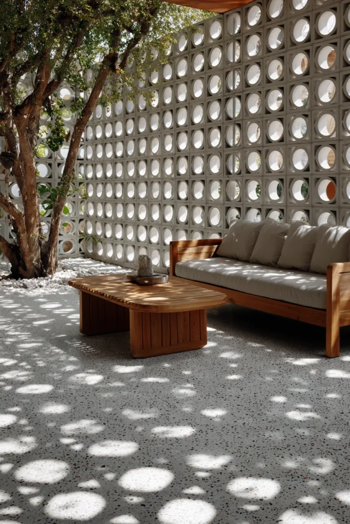 I honestly can’t get enough of how incredibly chic and sophisticated this space feels, it’s like a dreamy escape right in your own backyard! The interplay of light and shadow created by those iconic breeze blocks is pure artistry, and the natural materials—wood, stone, and the tree—make it feel so grounded and harmonious. This patio is the perfect blend of architectural interest and natural tranquility, a truly inspiring spot to unwind and recharge