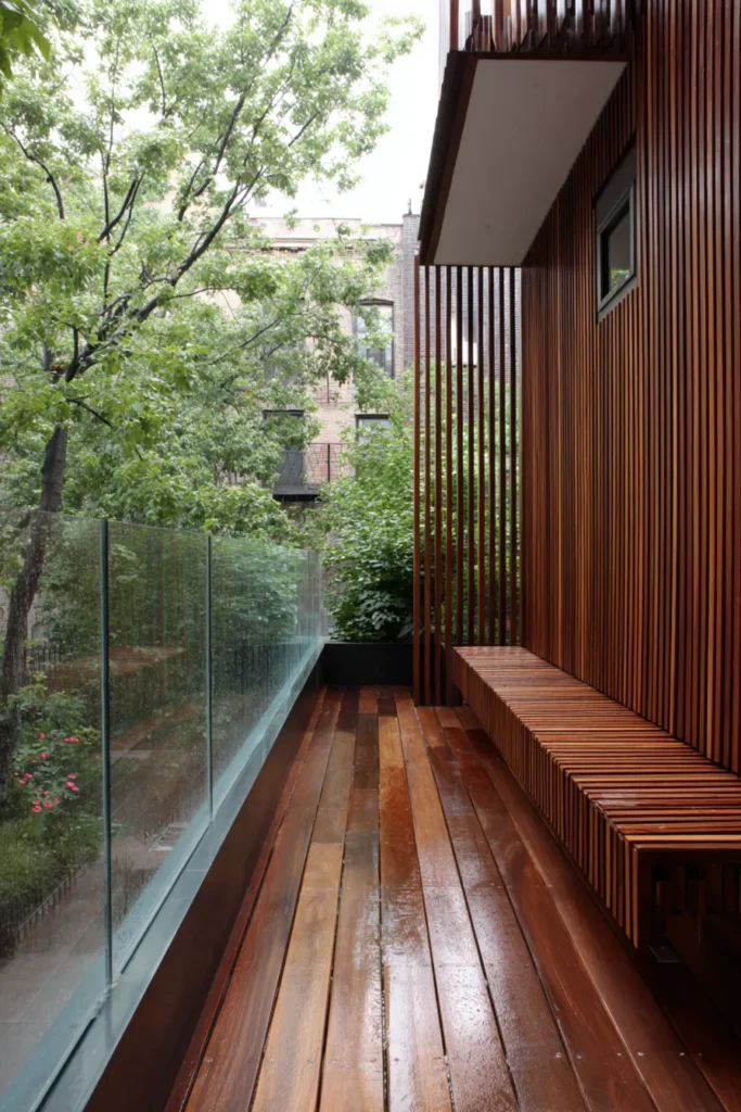 I absolutely adore how this design maximizes a smaller outdoor space while making it feel like a luxurious, secluded retreat high above the city! The sheer richness of that wood is so grounding and inviting, and the way the vertical slats draw your eye upward adds a wonderful sense of height and drama. It’s a beautifully unfussy and sophisticated spot that makes the greenery the star, which is just brilliant in my book.