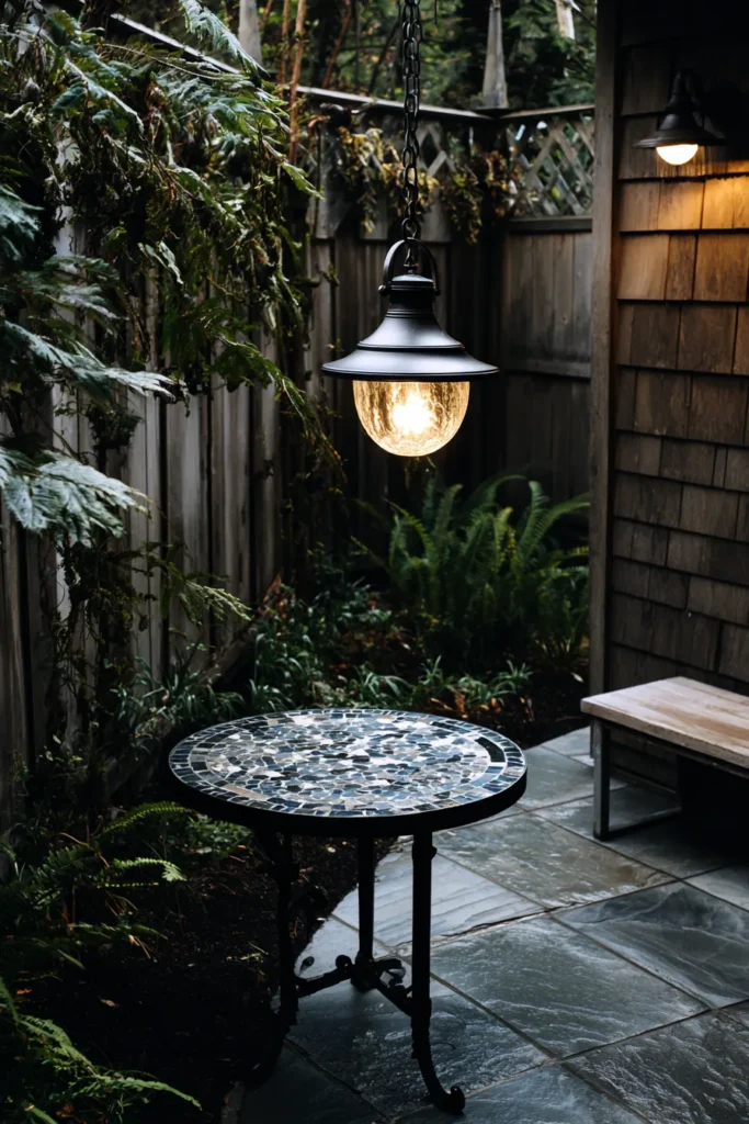 This little hidden patio corner is serving up some serious cozy charm with its wonderfully textured and enclosed design, giving off a cozy, slightly moody retro vibe. The space is anchored by an enchanting round mosaic bistro table with an antique-style metal base, surrounded by lush ferns and dark greenery that create a sense of deep privacy. The walls are clad in a beautiful mix of weathered wood planking and cedar shake siding, adding layers of cozy texture, while a hanging vintage-style pendant light casts a warm, inviting glow over the intimate space.