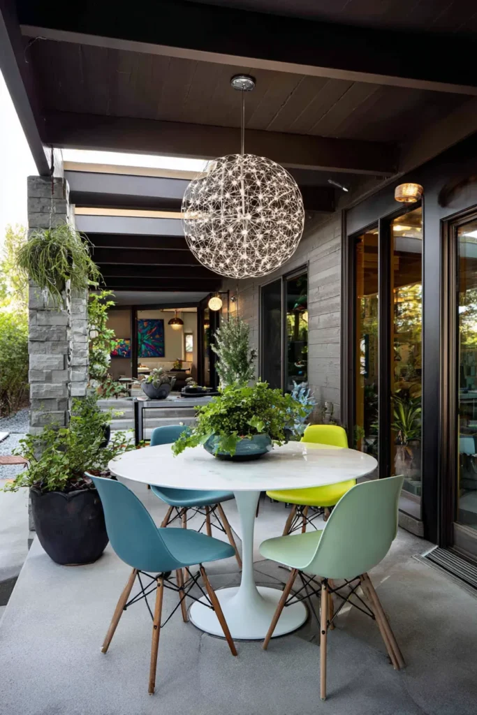 I think the simple elegance of a modern dining set outdoors is just breathtaking because it elevates the whole experience of eating al fresco from casual to truly special. That classic spherical pendant light is such a wonderful mid-century touch—it’s like a piece of art that illuminates your gathering perfectly and instantly makes the patio feel like a stylish outdoor extension of your formal dining room. It’s a flawless look for anyone who loves hosting in style!
