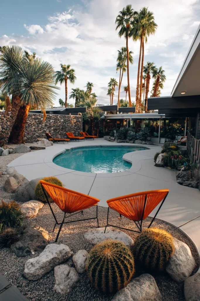 Prepare for serious wanderlust because this pool and patio area transports you straight to a luxurious desert retreat. It features the quintessential Mid-Century kidney-shaped pool with a wide, minimalist concrete deck that’s beautifully framed by low, desert-friendly landscaping and stunning palm trees. The orange wire chairs in the foreground provide a vibrant, graphic pop of color that feels so authentically vintage against the neutral gravel and striking barrel cacti.