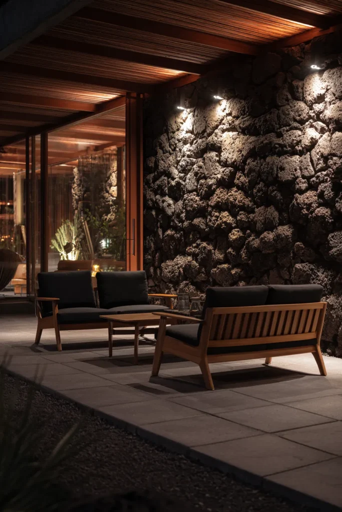 This patio takes the concept of texture and drama to a whole new level, embracing a truly atmospheric and sophisticated look perfect for evening relaxation. The centerpiece is a stunning wall of dark, rough volcanic stone, dramatically highlighted by simple directional lighting which creates incredible shadows and visual depth. The furniture features simple, clean lines with teak-toned wood frames and plush dark cushions, making it feel incredibly chic and cozy at the same time.