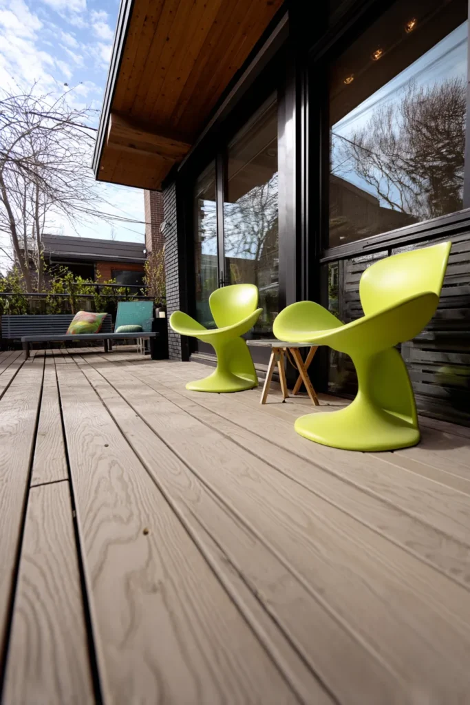 Here is a super fun take on the mid-century deck, pairing traditional materials with boldly contemporary furniture to great effect. The design features a multi-toned wood plank deck extending from the house, which has sleek, dark trim around the floor-to-ceiling glass doors. The real showstoppers are the two lime-green chairs whose whimsical, almost sculptural shape injects a brilliant dose of playful personality and color into the space.