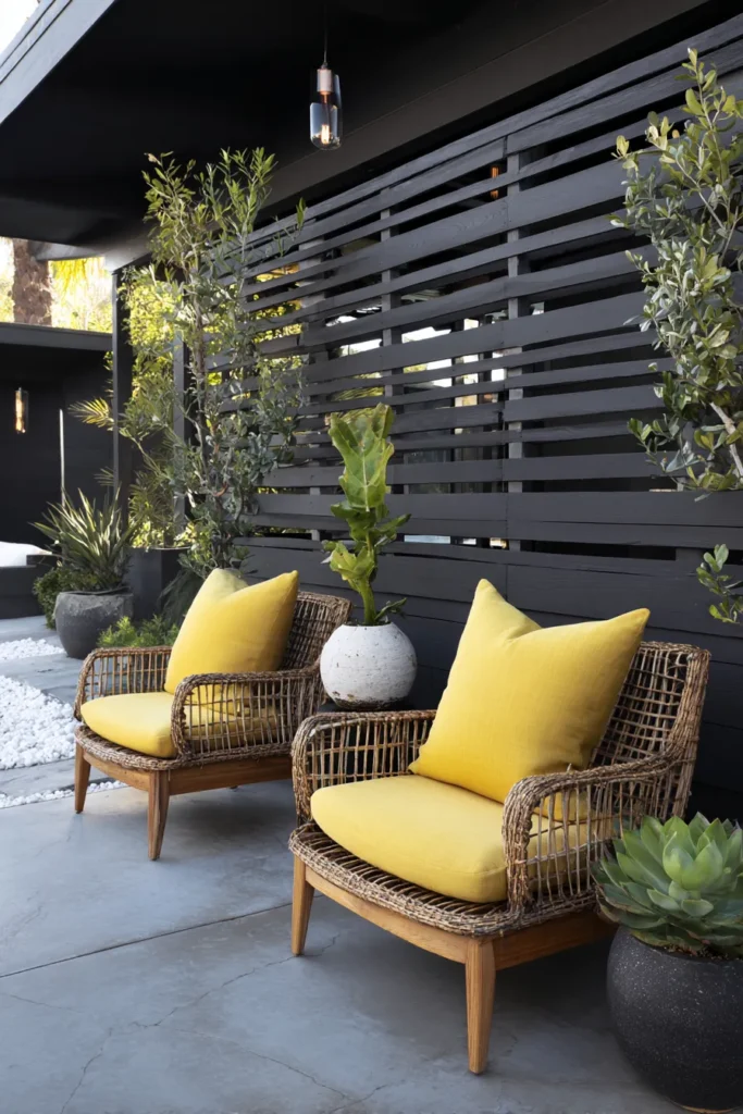 This intimate corner of the patio achieves maximum style with a minimum of fuss, using high-contrast color and linear architecture to create a chic moment. The background features a striking black horizontal slatted screen that offers privacy while still letting light and greenery peek through, instantly adding that classic Mid-Century geometric flair. The seating is a pair of inviting woven wicker chairs softened by huge, vibrant sunny yellow cushions that just make you want to sink right in.