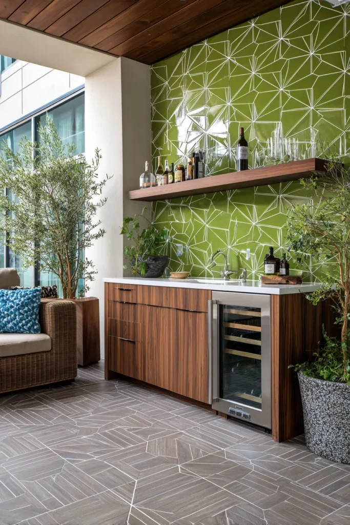 Talk about a statement piece—this patio kitchen is a masterclass in adding personality through unforgettable texture and color. The functional counter area, featuring sleek wood cabinets and a wine fridge, is fantastic, but the real star is the wall covered in that stunning lime-green geometric tile. The floating wood shelf above completes the look, creating a beautiful, uncluttered space perfect for mixing up a classic retro cocktail.