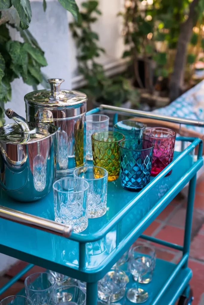 No Mid-Century patio is complete without the perfect setup for serving a fabulous retro cocktail, and this teal bar cart is pure fun! The bright, glossy finish and chrome handles give it that essential vintage feel, making it functional and a statement piece. It’s perfectly styled with a shiny chrome ice bucket and an assortment of vibrant, textured glassware in jewel tones like ruby, amber, and sapphire.