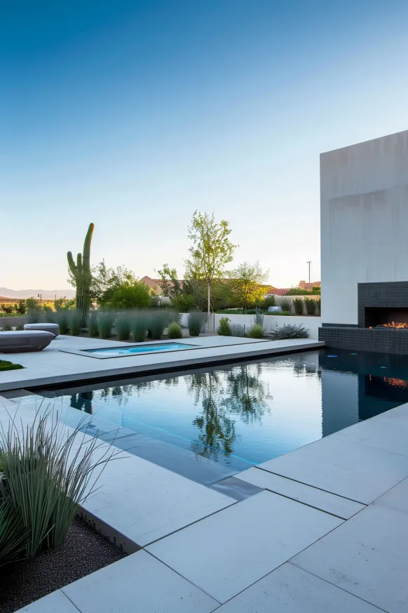This sleek and modern backyard design combines minimalist elegance with natural elements. A perfectly clean-lined pool is surrounded by smooth, geometric tiles that create a seamless flow. The white walls and simple greenery, including a standout cactus, add to the tranquil and spacious vibe. The subtle yet sophisticated landscaping with tall grasses and shrubs completes the contemporary look, offering a peaceful retreat in the heart of the home.