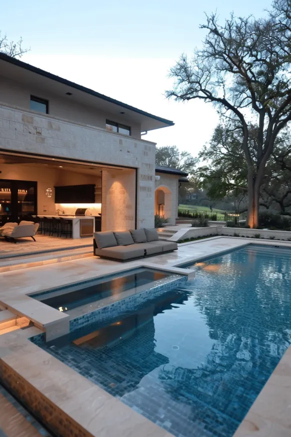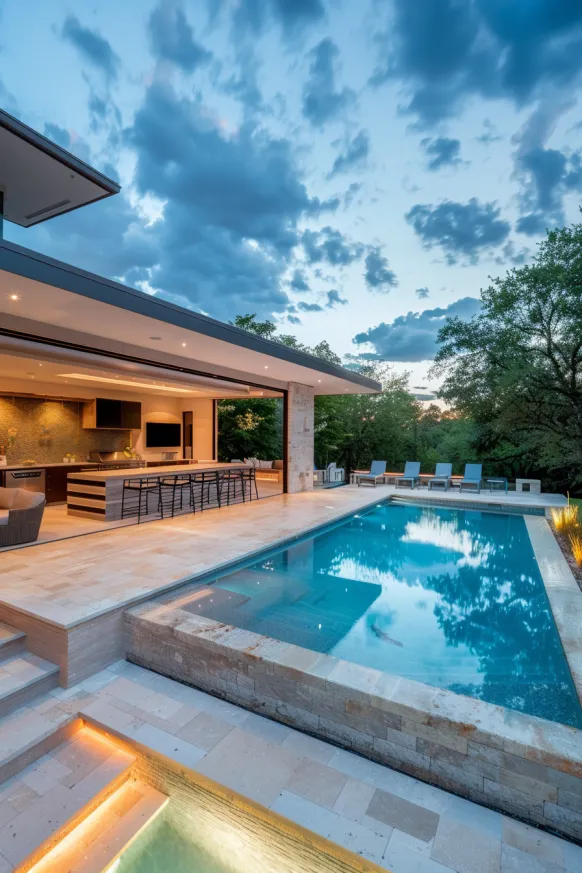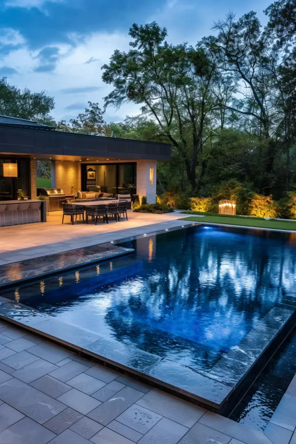 What I absolutely love about this design is how effortlessly it combines luxury with functionality. The outdoor kitchen area is perfect for hosting guests while still being able to enjoy the pool. The lighting at night just adds a whole new level of sophistication, making the space feel cozy yet grand. It’s a modern entertainer’s dream, with all the right elements for a perfect evening!