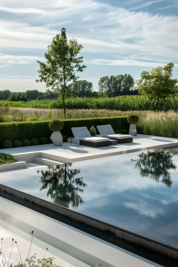 This modern pool design is all about clean lines and minimalist beauty. The pool features a smooth, reflective surface that mirrors the sky and surrounding trees, creating a calming, almost meditative feel. The stone platform around the pool is perfectly balanced with a simple, stylish seating area, offering a tranquil space to relax. Lush greenery frames the pool, enhancing the serene and sophisticated atmosphere.