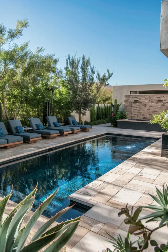 This modern pool design radiates calm and style with its sleek rectangular shape and inviting lounging area. The pool is surrounded by large, beautifully laid stone tiles that complement the rich greenery and vibrant plants around the space. A stunning water feature at the far end of the pool adds a touch of luxury, while the neatly arranged lounge chairs with colorful cushions provide the perfect spot to unwind.