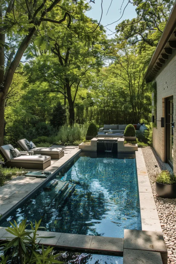 I absolutely love how this design feels like a peaceful escape right in the heart of nature. The way the water feature blends seamlessly into the surroundings creates a calm, serene environment that invites relaxation. It’s the perfect combination of modern elegance and natural beauty, offering both luxury and a connection to the outdoors. This is definitely the kind of backyard you can imagine yourself spending hours in, soaking up the tranquility. It’s a little slice of paradise!