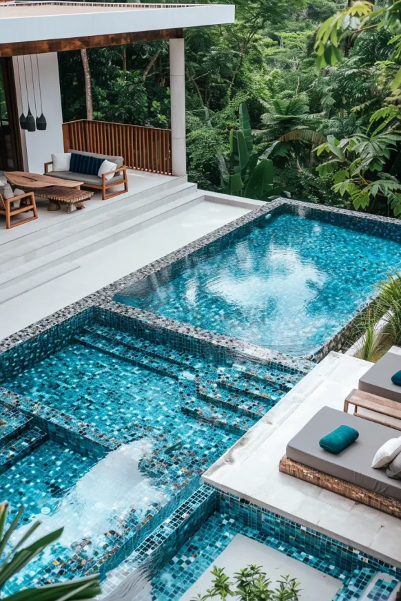 This pool design stands out with multiple levels, each section providing a distinct area for relaxation. The stunning mosaic tiles in rich blue hues cover the pools, enhancing the tropical feel of the space. The sleek, minimalistic patio area with cozy seating perfectly blends with the lush greenery surrounding the pools, offering a seamless transition between water and nature. The combination of the clean lines, vibrant tiles, and surrounding plants creates a peaceful, inviting atmosphere.
