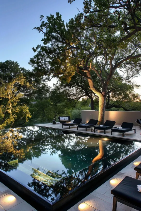 This modern infinity pool design offers a breathtaking view, with its sleek, dark water reflecting the surrounding trees and sky. The pool is framed by clean, light-colored stone tiles that give it a contemporary, minimalist look. Soft lighting around the pool adds an elegant touch, while the glass fencing ensures that nothing obstructs the spectacular view of the lush greenery and trees.