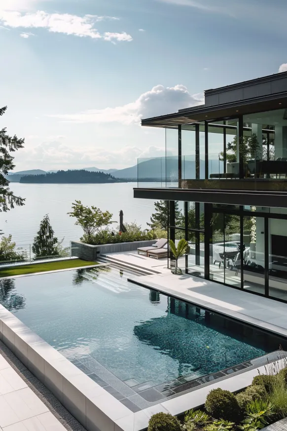 This modern pool design is a true showstopper, offering not only a sleek geometric shape but also the most stunning view of the lake and surrounding landscape. The pool’s clean lines are complemented by contemporary stone tiles and lush greenery, which blend perfectly into the natural beauty of the environment. The glass railing adds an airy, open feel, allowing unobstructed views of the horizon from the comfort of the poolside.