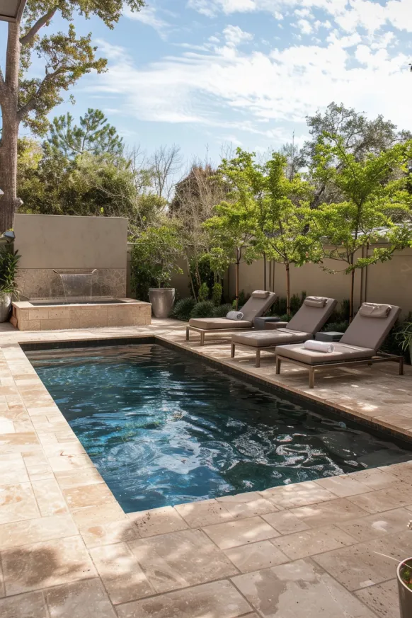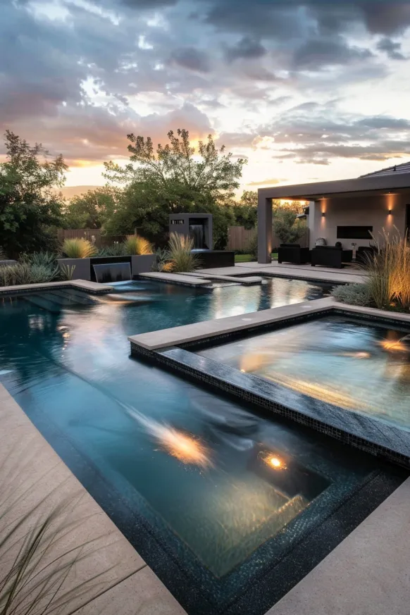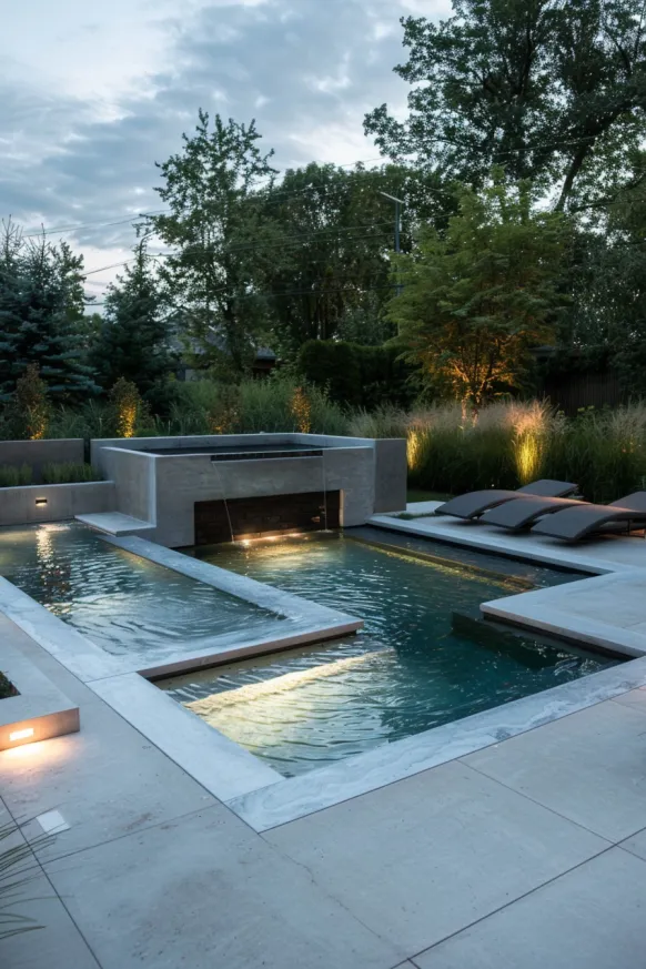 This modern backyard pool design features a beautiful water fountain spilling gently from a raised platform, adding a soothing sound to the serene space. The sleek, geometric pool is lined with smooth stone tiles, providing a minimalist look that contrasts perfectly with the lush greenery surrounding it. At night, soft lighting around the pool and in the garden enhances the ambiance, creating an intimate and peaceful retreat.