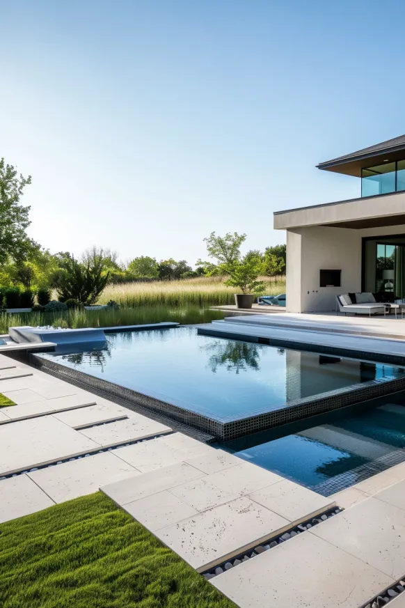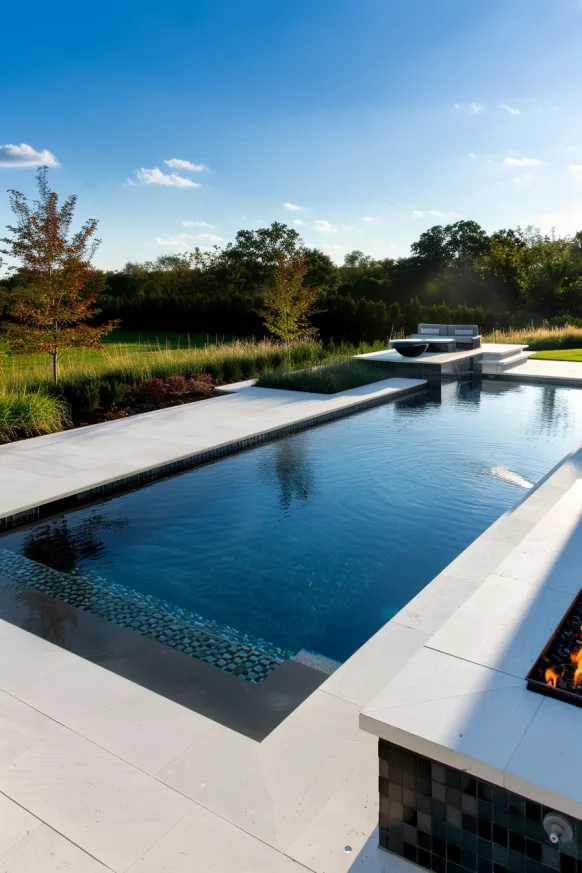 This modern backyard pool design blends clean lines with a touch of luxury. The spacious pool is framed by elegant white stone, contrasting beautifully with the dark tiles of the fire pit feature nearby. The serene water flows effortlessly into the landscape, with minimalistic green accents from the surrounding trees and grass, creating a peaceful yet modern ambiance.