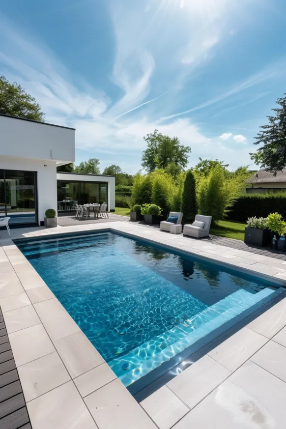 This modern pool design is the epitome of sleek sophistication, featuring sharp lines and clean edges that complement the minimalist style of the home. The rectangular pool is perfectly framed by light-colored tiles, creating a chic and polished look. The surrounding landscape is beautifully manicured with tall greenery and potted plants that add just the right amount of softness to the bold architecture. Large glass windows from the house allow for an unobstructed view of the pool area, seamlessly connecting the indoor and outdoor spaces.