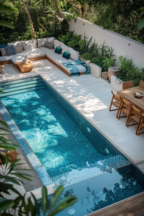 This modern backyard pool design offers an inviting and stylish atmosphere with its rich array of textures and thoughtful layout. The pool features a stunning mosaic tile pattern that gives it a unique touch, while the comfortable lounge area is perfectly set with cozy, deep cushions on built-in wooden seating, creating an ideal place for relaxation. The surrounding plants add a touch of greenery, complementing the soft tones of the furniture and the pool’s clear water. Nearby, a lovely dining table provides the perfect spot for al fresco meals with family and friends.