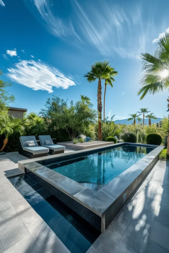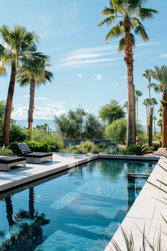I absolutely love the clean, elegant vibe of this design. It feels both luxurious and peaceful, like a little sanctuary in the desert. The palm trees give it that vacation-worthy feel, while the modern pool design makes it feel like a sophisticated escape. I can totally imagine myself lounging by the pool, sipping on a cool drink, and enjoying the perfect weather – this is backyard goals, for sure!