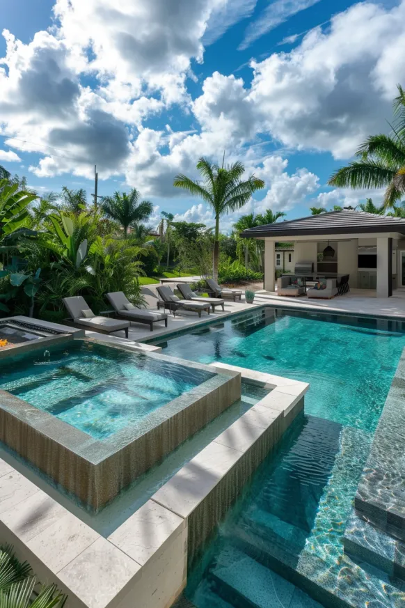 This stunning backyard pool features a luxurious design with a sleek rectangular shape and waterfall elements that cascade gently into the water. The surrounding stone decking gives it a polished yet natural feel, and the perfectly placed lounge chairs invite relaxation. The lush tropical plants around the pool create an inviting and refreshing atmosphere, while the modern design is balanced with the calming sounds of flowing water.
